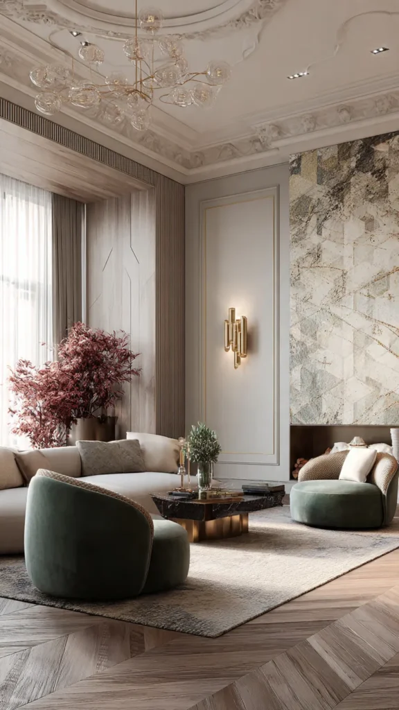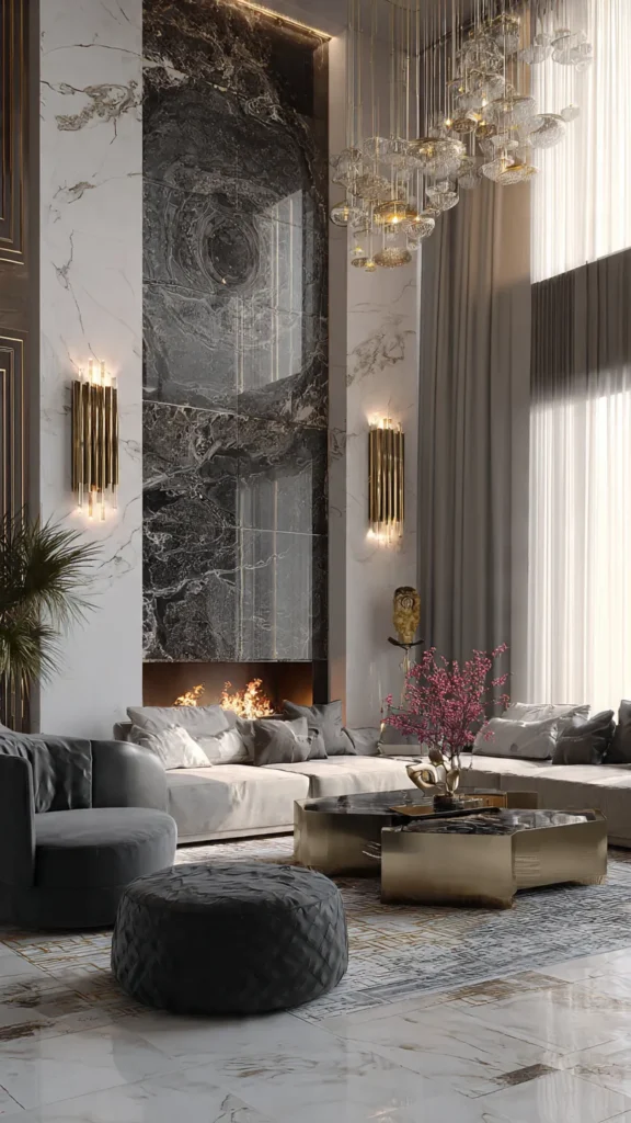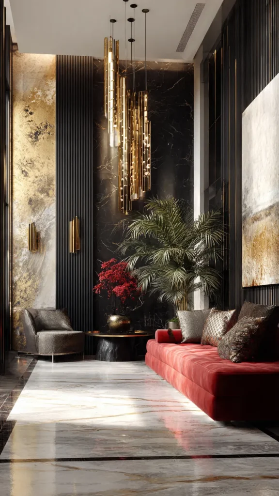 Lighting plays a vital role in setting mood and ambiance. Layered lighting — including chandeliers, wall sconces, and LED accents — enhances texture, highlights features, and adds a luxurious glow to the space.