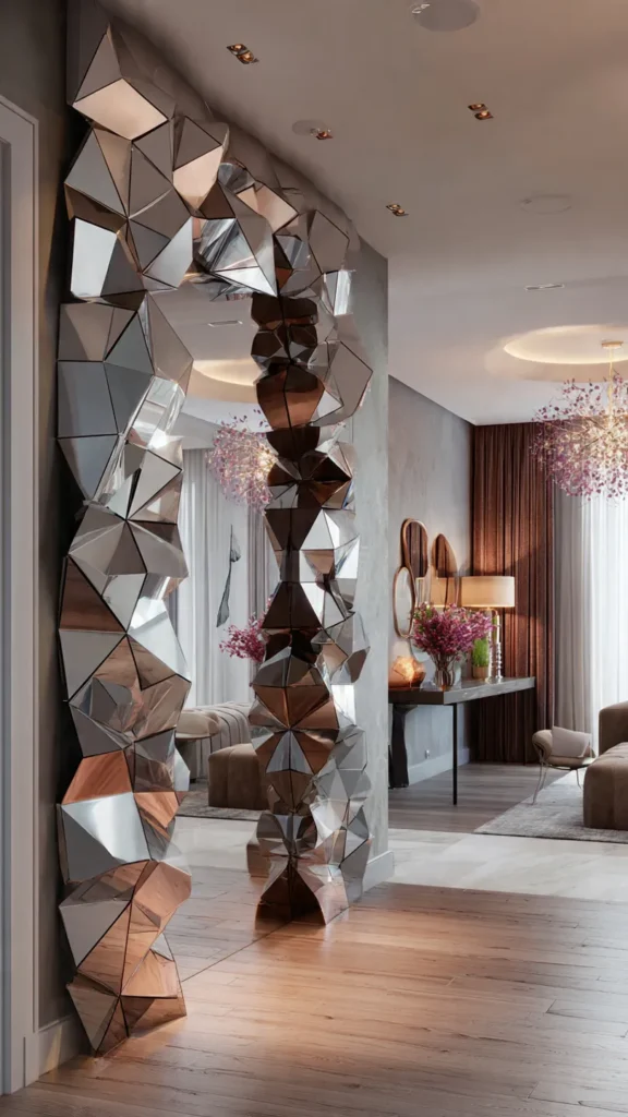 Round, arched, or geometric mirrors arranged in a gallery-style layout can turn a plain wall into a focal point. Decorative mirror walls work beautifully in entryways, staircases, and dining areas where first impressions matter most.