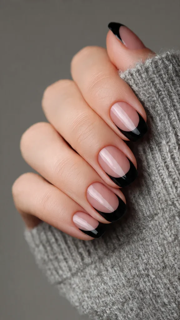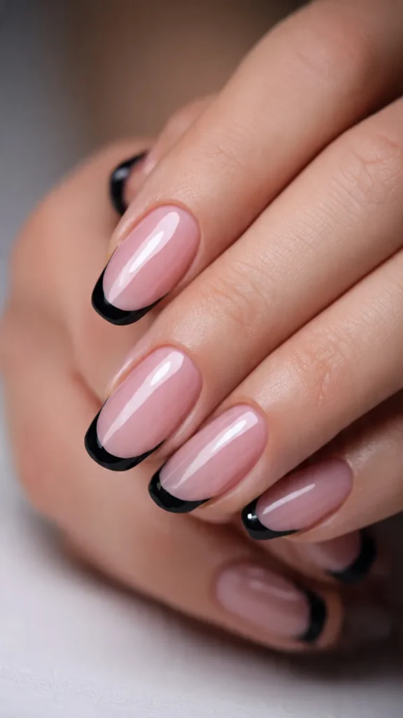 Apply a nude base, use black polish for the tip with a thin nail brush, and seal it with a glossy or matte top coat for a clean, sharp finish.