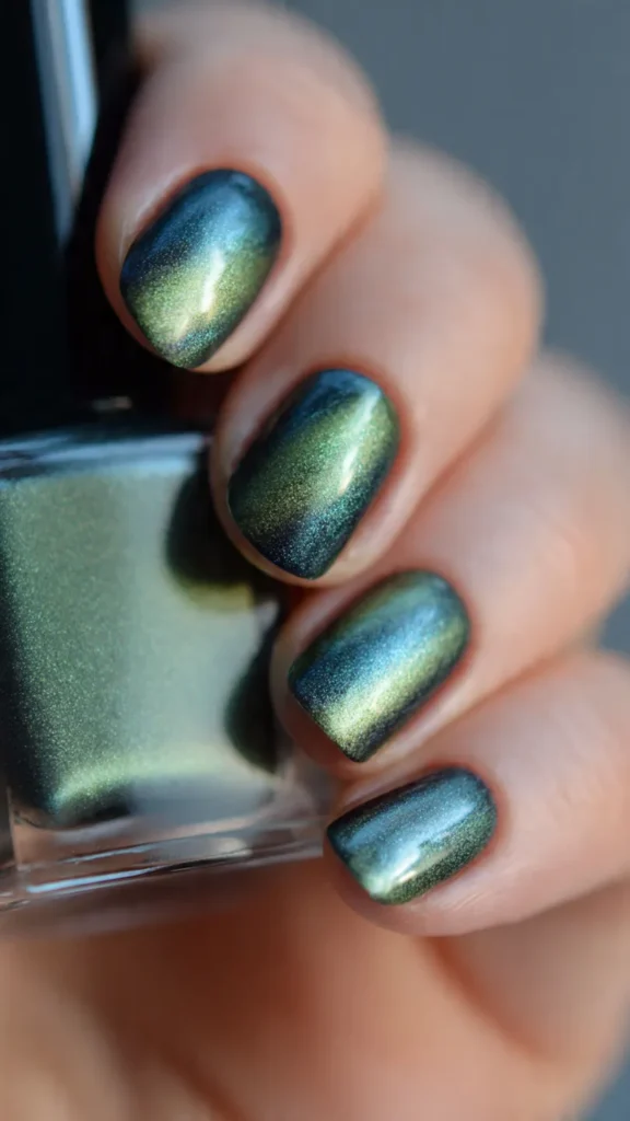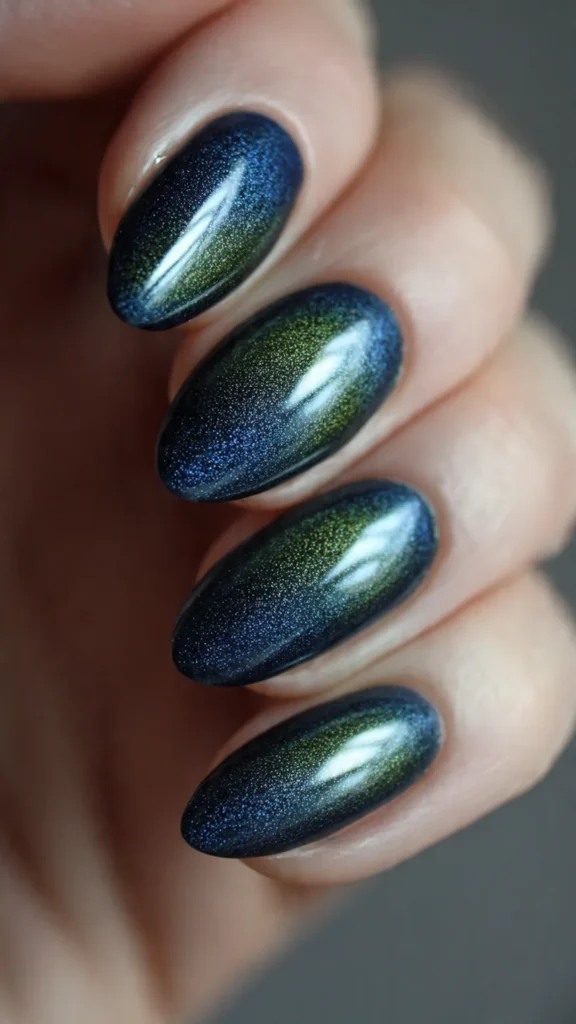 Cat eye nail polish is a magnetic formula that creates a beautiful, shimmering “line of light” effect across the nail—just like a cat’s eye. This design has resurfaced as a top viral trend thanks to TikTok and salon content.