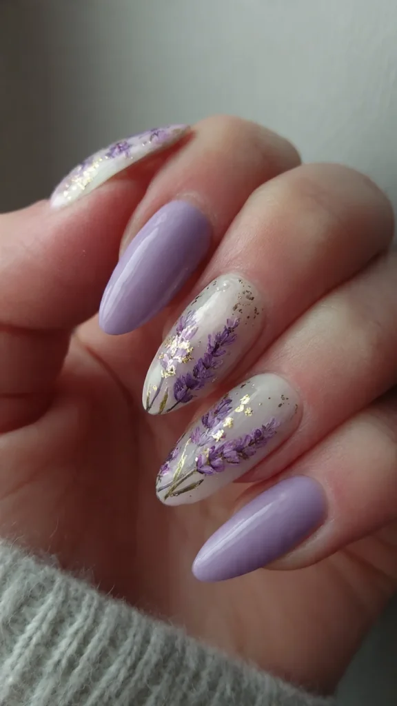 Try pastel lavender, chrome lavender, aura lavender, floral accents, matte lavender, or lavender with gold foil for a soft aesthetic look.