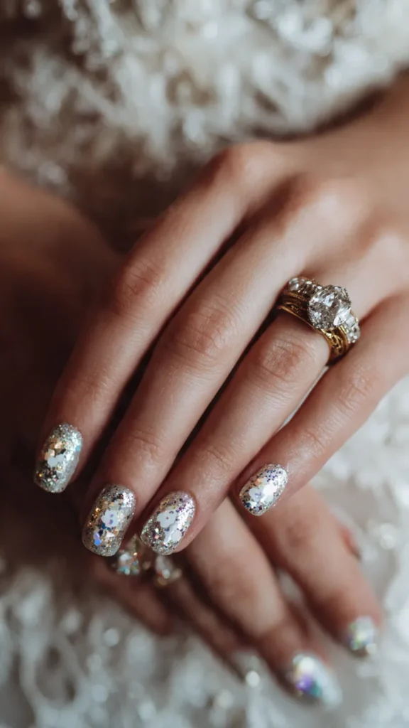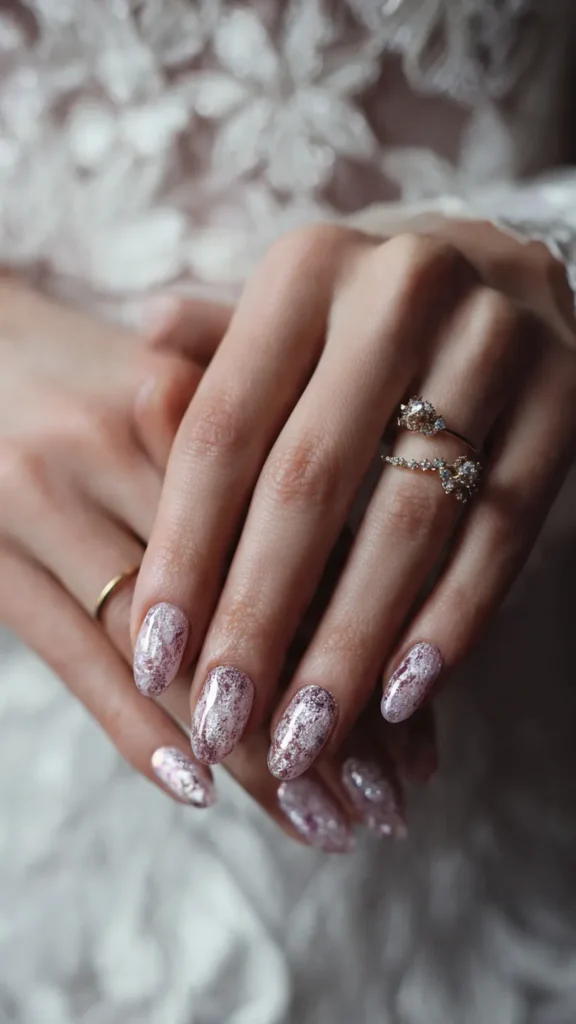 Wedding nails should emphasize femininity and look flawless in close-up ring photos.