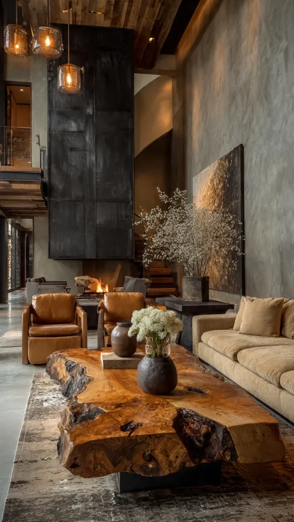 Combine sleek modern furniture with raw natural materials. Example: a streamlined sofa with a wooden coffee table, linen curtains, minimalist décor, and sculptural greenery.