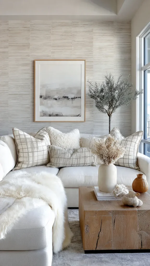 - Cozy textiles such as knit throws, wool rugs, and neutral cushions