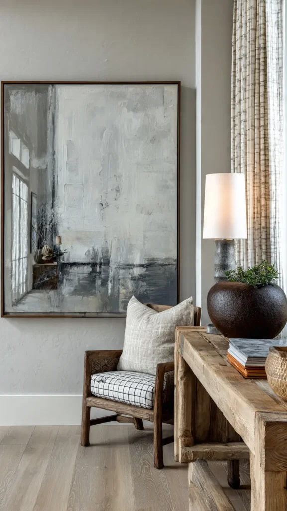 - Subtle decor such as ceramic vases, soft candles, and framed minimalist art