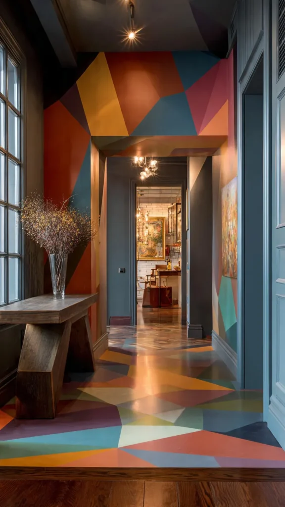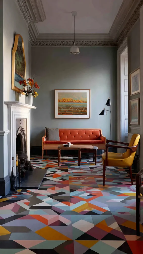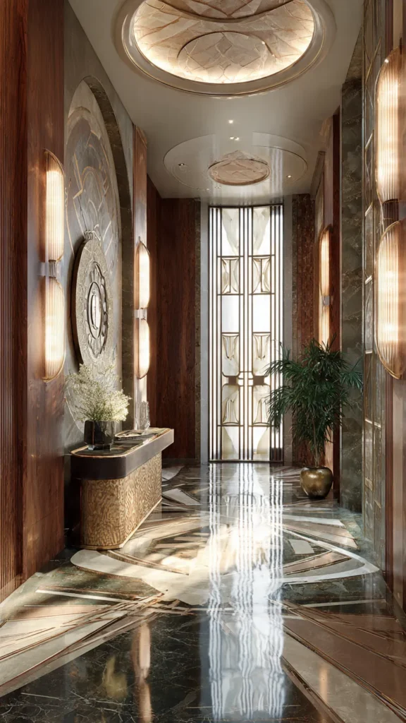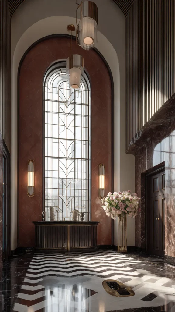 Geometric patterns define the Art Deco aesthetic. Use chevron rugs, octagon mirrors, honeycomb wall accents, or patterned tiles to add structure, rhythm, and visual interest to your rooms.