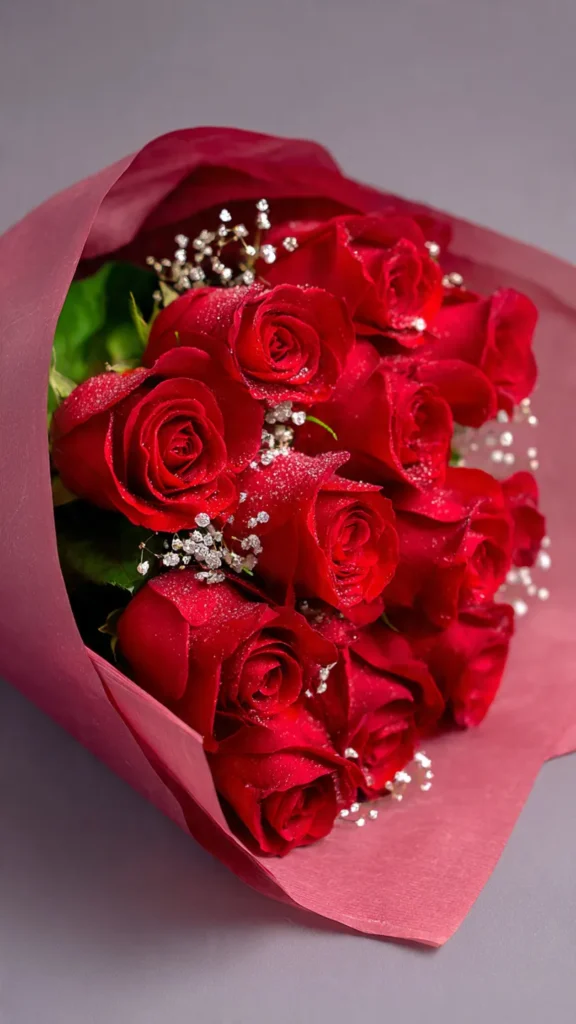 The Valentine’s Day Rose Bouquet usually features a dozen or more long-stemmed roses, often enhanced with love-themed decorations, luxury boxes, or vases.