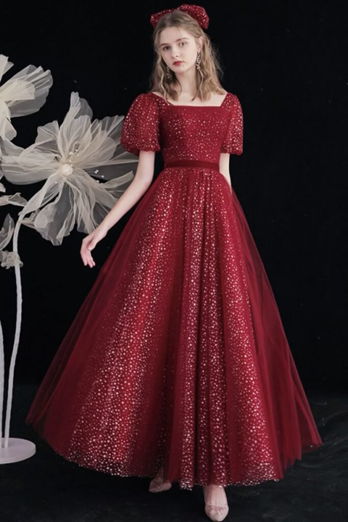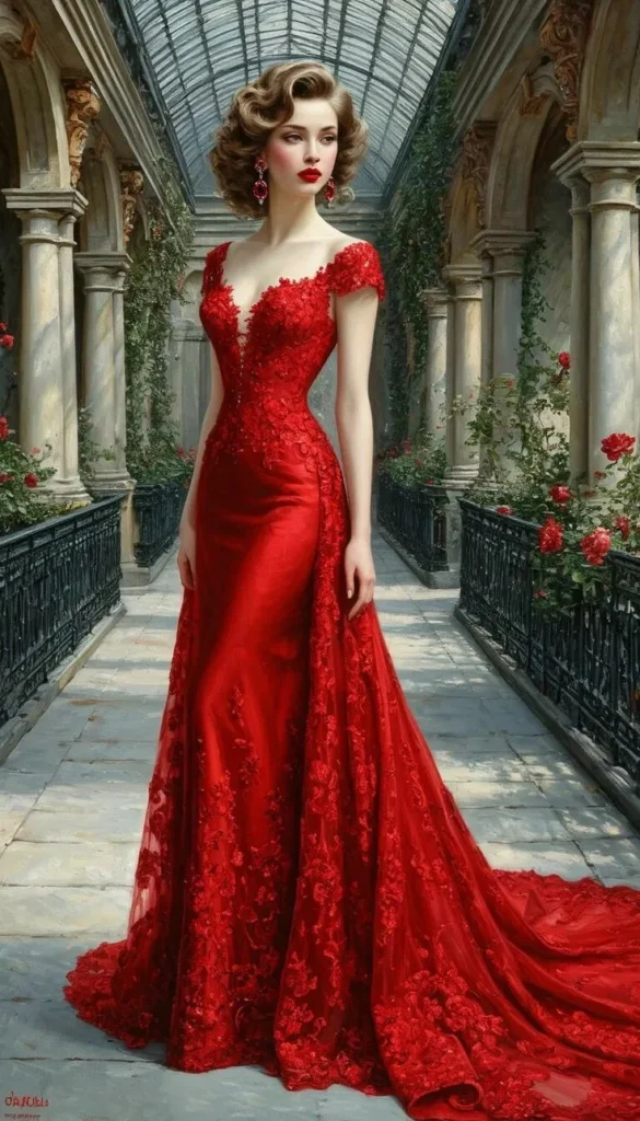 - Shoes: Metallic gold, nude, or even matching red heels complement the dress.