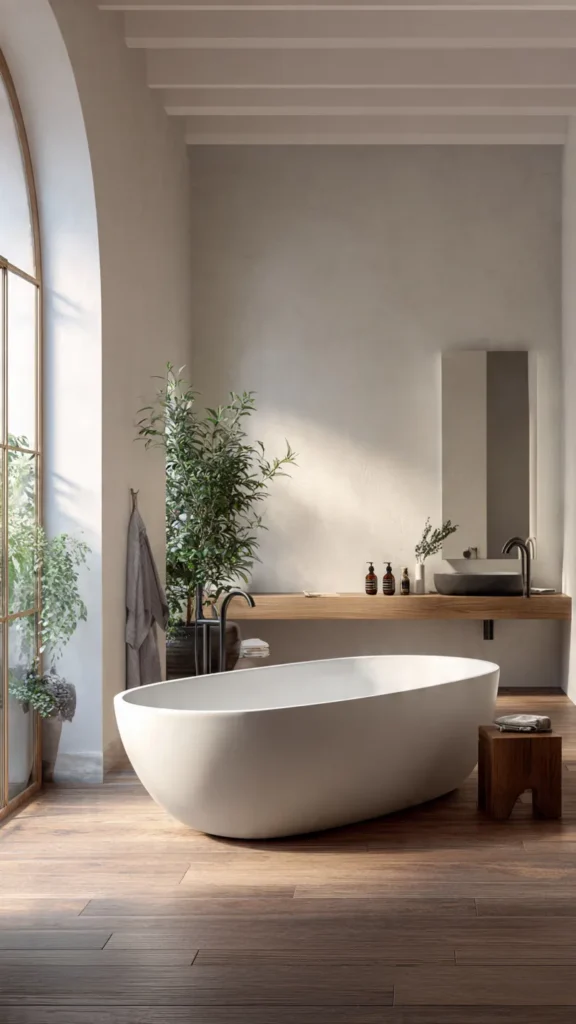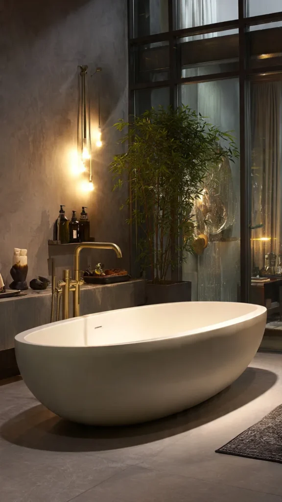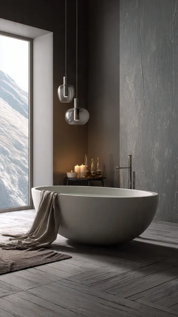 These bathtubs work beautifully with a nature-inspired Scandinavian theme because they resemble soft stones or smooth ceramics. For a complete spa feel, add touches like: