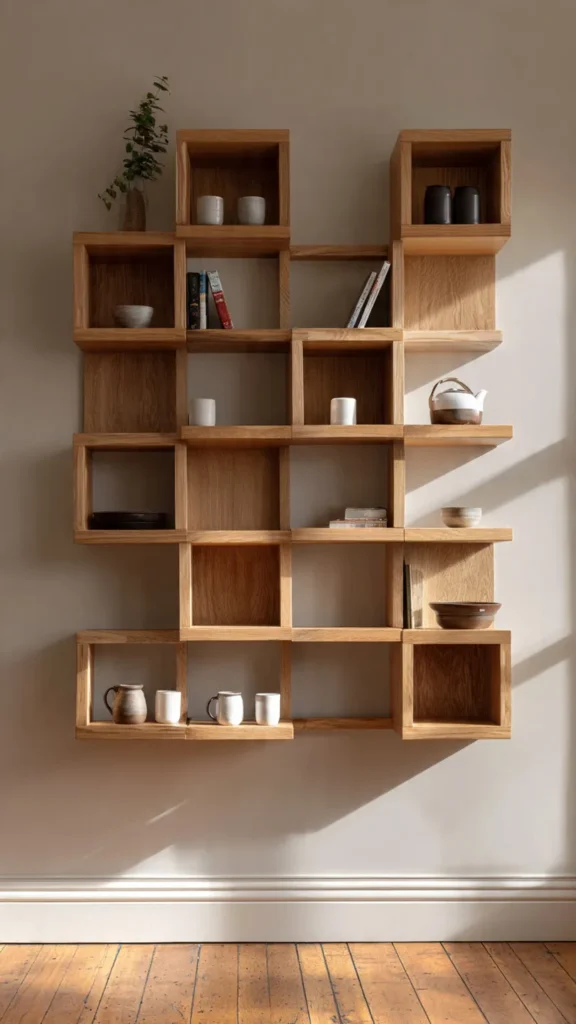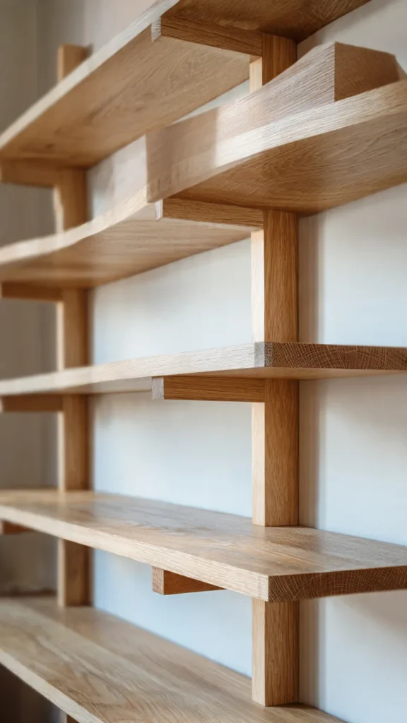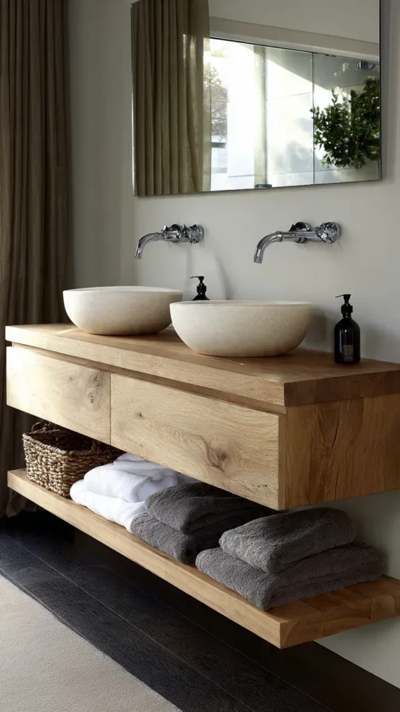 Wood shelving is not only functional—it’s essential for creating warm texture in Scandinavian bathrooms. Light oak or birch wood shelving solutions add practical storage while enhancing the natural aesthetic.