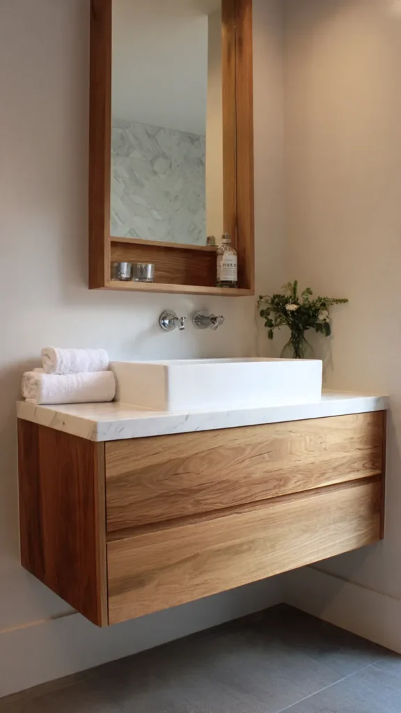 One of the core elements of Scandinavian interior design is the use of natural wood. This is where natural wood floating vanities with clean lines become a defining feature in modern bathrooms. A floating vanity visually opens up the room, making even a small bathroom feel lighter, bigger, and more airy.