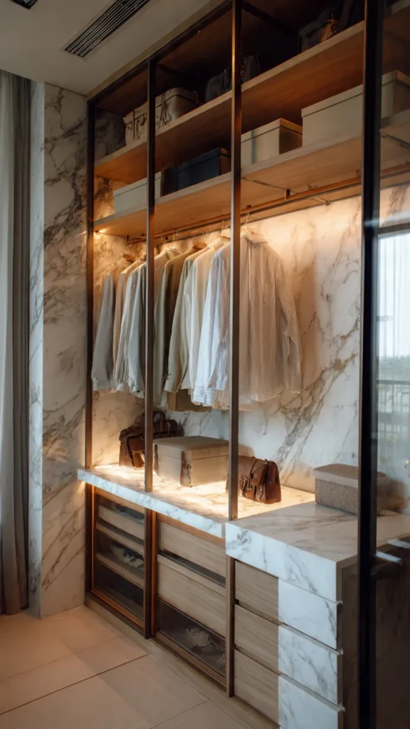 Open concept wardrobes are all about accessibility and efficiency. Instead of doors, clothing and accessories are displayed neatly, turning storage into decor.