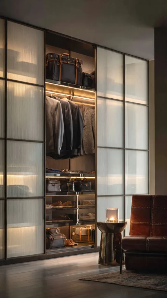 Frosted, tinted, or ribbed glass is best for bedrooms, as it maintains privacy while adding style. Soft interior lighting behind the glass enhances the glamorous look.