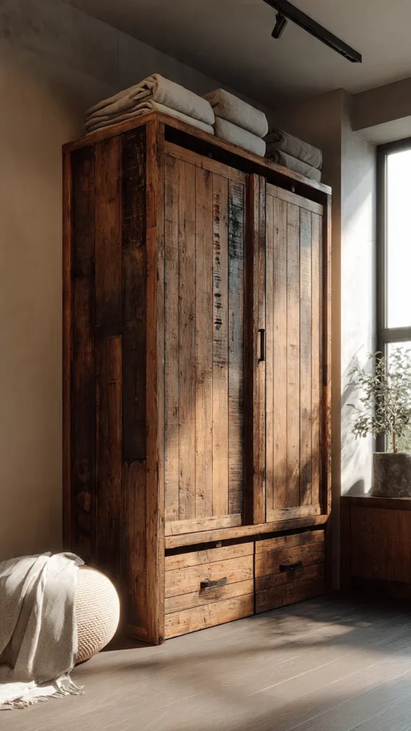 This style aligns with high-intent searches like rustic built-in wardrobe, natural wood bedroom storage, and DIY wood furniture, making it highly relevant for Google AI Overviews.