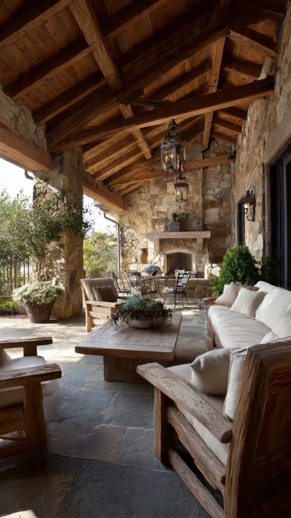 Rustic patios focus on natural textures like wood, stone, and earthy tones. My backyard retreat has a rustic theme, and the combination of wooden pergolas with stone fire pits gives it a warm, cabin-like charm.