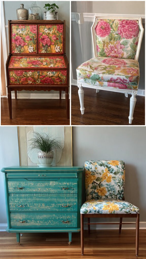 A furniture thrift flip offers the highest visual impact. Old dressers, side tables, chairs, and cabinets can be transformed into modern focal points.