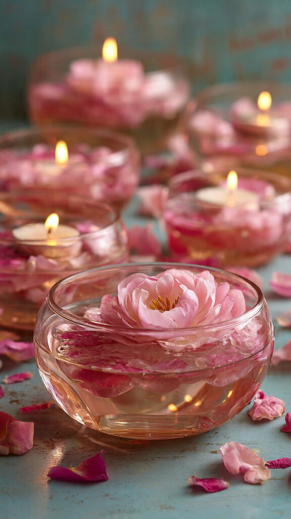 Floating candles in rose-tinted glass bowls bring soft, romantic lighting to your space. The gentle glow enhances ambiance and adds a touch of sophistication.