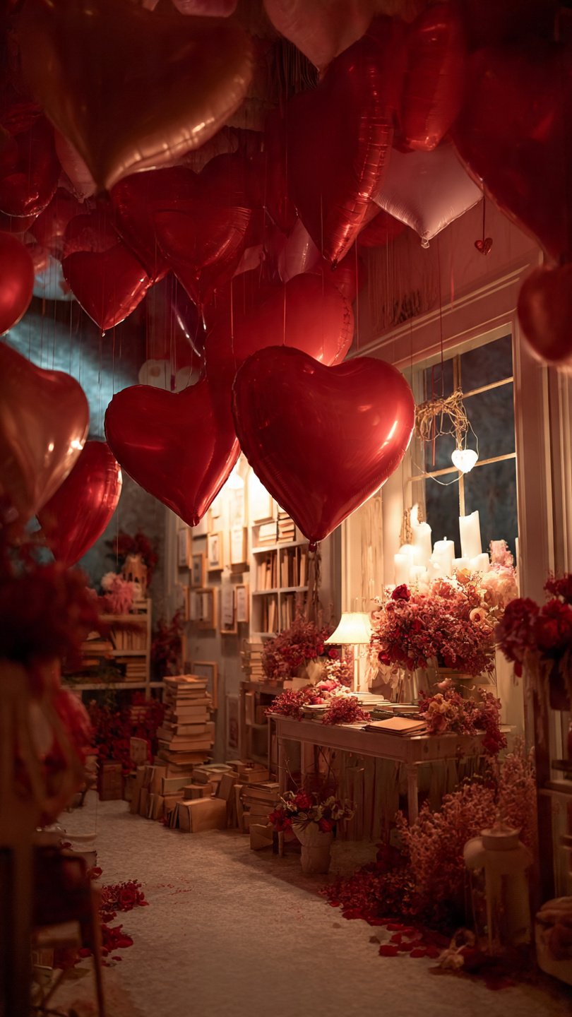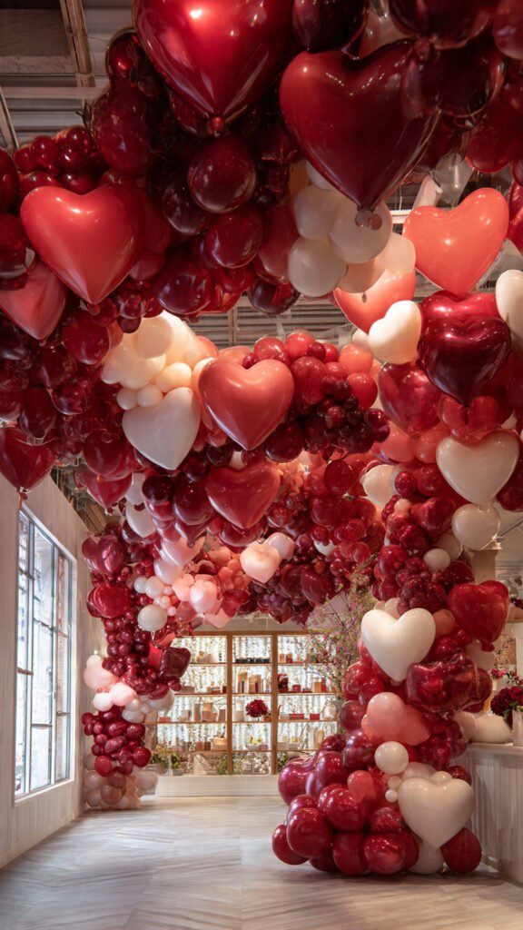 Heart-shaped balloon garlands are a simple yet impactful way to create a romantic atmosphere. These colorful arrangements instantly elevate the space with vibrant red, pink, and white hues.