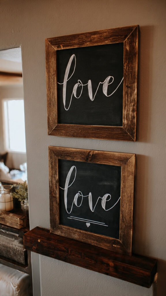 These are candles placed in water-filled rose-colored glass bowls, creating soft, romantic lighting and an elegant ambiance for tables, shelves, or centerpieces. - How can love quote chalkboard signs be used in décor?
