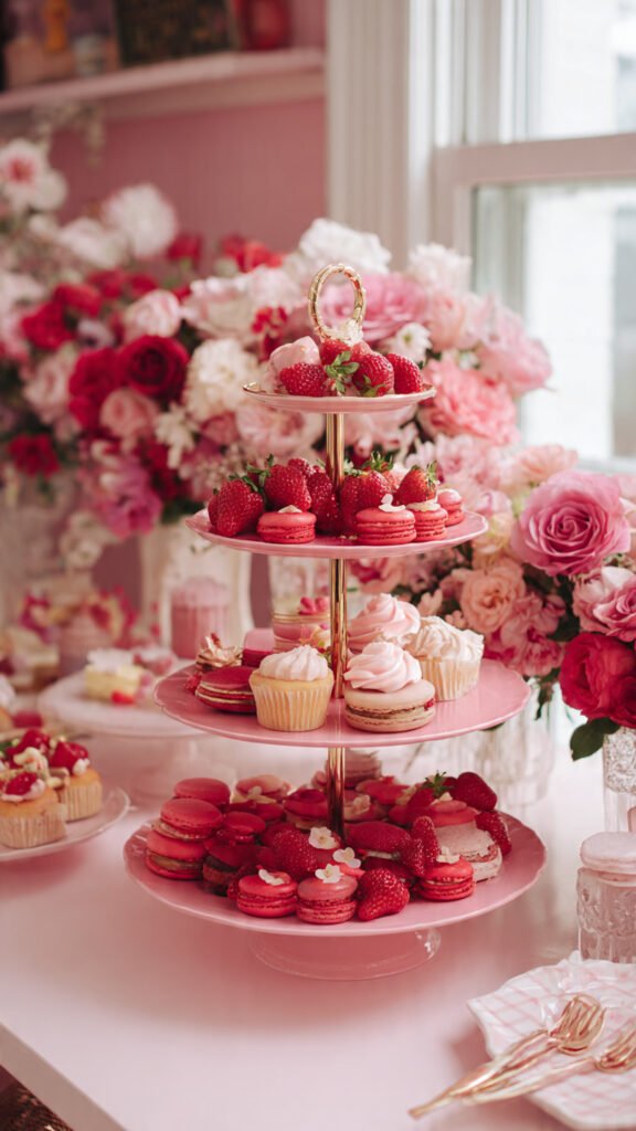 Tiered tray displays in red and pink allow you to organize multiple decorative elements like candles, chocolates, or flowers in a visually appealing and layered arrangement. - How can scattered rose petals enhance Valentine’s Day settings?