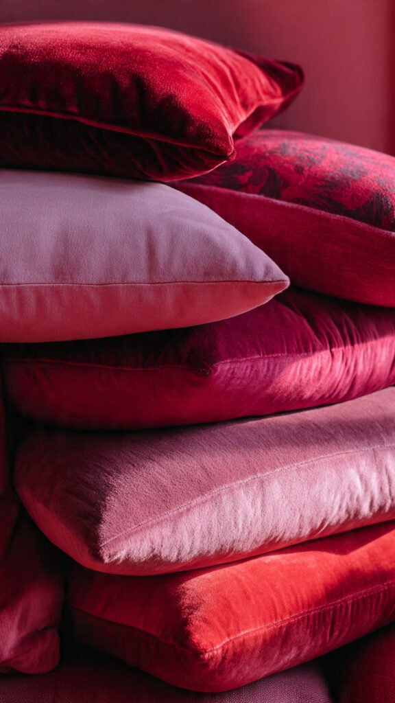 Velvet throw pillows in rich shades of pink and red create a cozy, intimate vibe for sofas, chairs, or beds. Soft textures enhance comfort while complementing Valentine-themed colors.