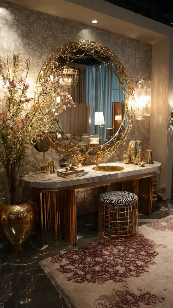 An ornate, gold-framed mirror can make even the smallest bathroom feel grand. Instead of buying new, I sourced mine from a flea market and refurbished it. The slightly weathered look actually adds to the charm.