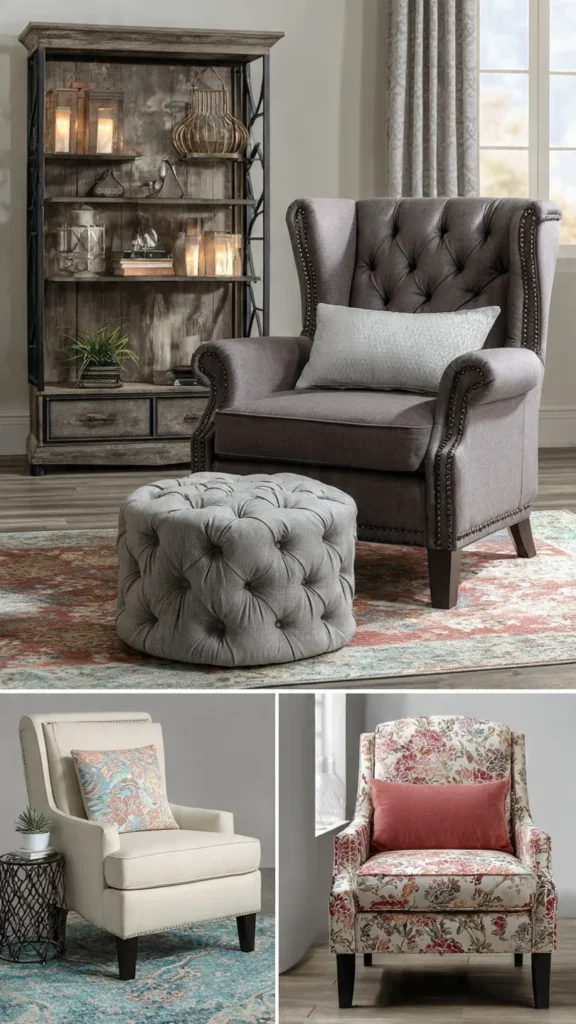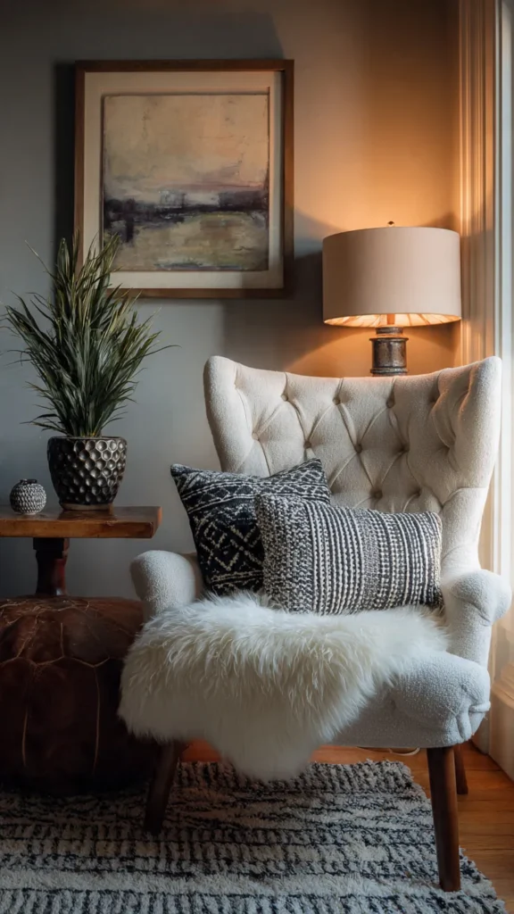 Add seating that doubles as décor. Choose bold textures like faux fur, leather, or woven rattan.