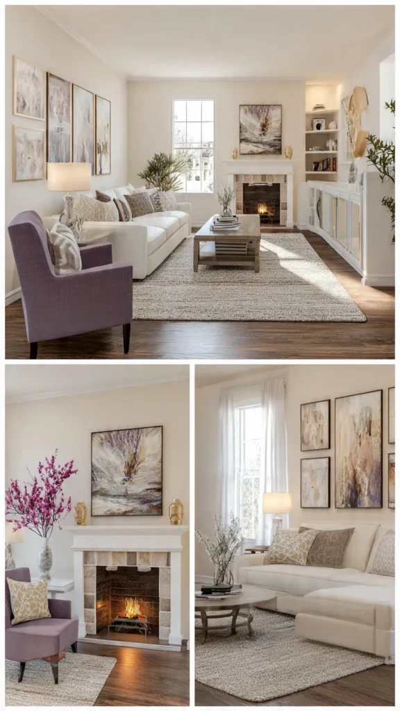 Mirrors help small living rooms look bigger, while oversized wall art adds personality instantly.
