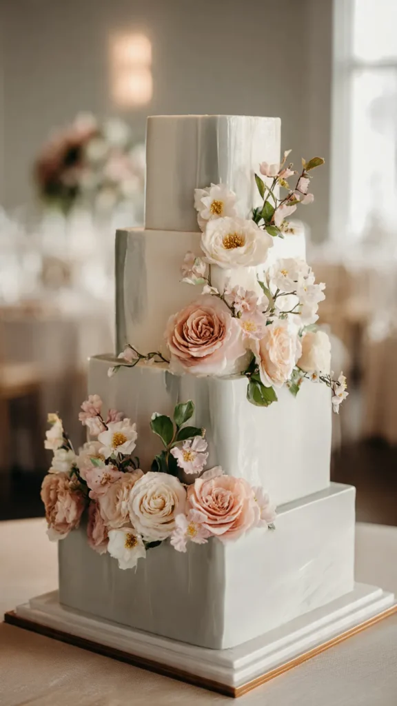 Modern tiered wedding cakes use clean lines, geometric shapes, and bold artistic details. This style is perfect for couples who want a cake that feels fresh, fashionable, and visually captivating.