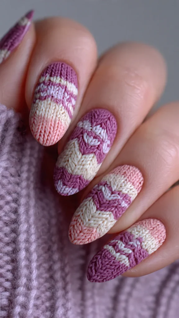 Cozy sweater nails emulate the texture of knitwear on nails—a fun and unique Winter nails art idea.
